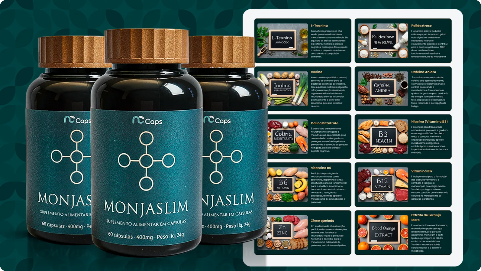 O MonjaSlim combina ativos de alta qualidade em uma fórmula única, pensada para atuar em diferentes frentes do emagrecimento saudável. Abaixo você encontra a descrição completa de cada ingrediente e sua função no organismo: